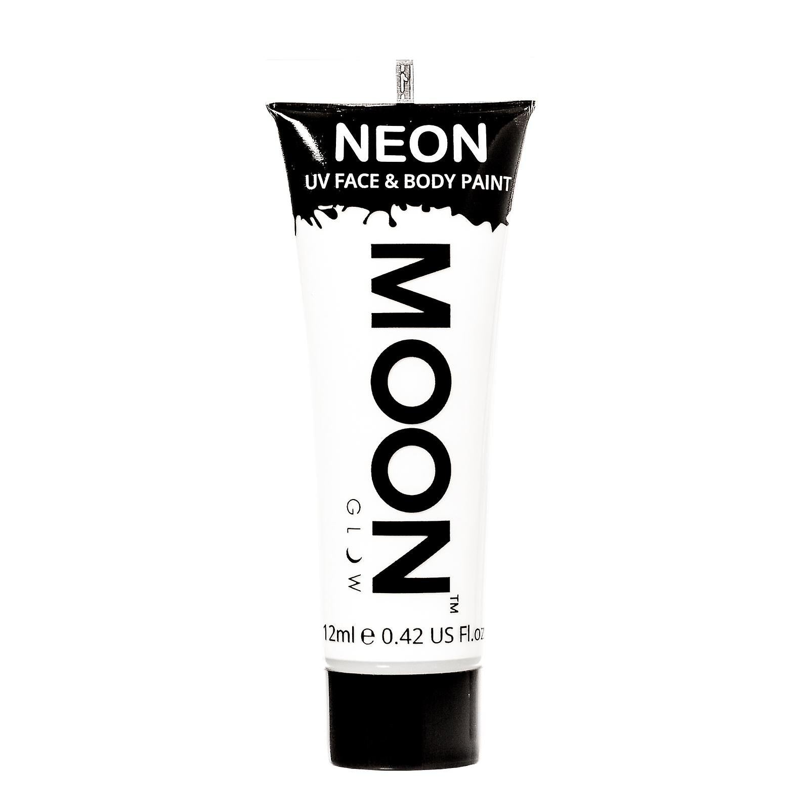 Create stunning effects on the face and body using Moon Glow face and body paints. Bright, neon coloured in natural lighting, these paints fluoresce spectacularly under UV Lighting/Blacklights, producing an incredible UV Glow. The unique flake free and smudge resistant formula ensures your designs will last all night! Perfect for clubbing, parties, festivals, UV sports, stage performances and anywhere with UV Lighting. To use, simply remove the foil tip and apply to skin using fingers, a brush or sponge. Avoid Contact with eyes. Add more layers (once dry) to increase the effect under UV. After use, simply remove using soap and water. All Moon Glow cosmetic and special effect products are proudly made in the UK. Dermatologically tested, non toxic and conforms to EU1223/2009. Moon Glow products are not tested on animals. Colours Available: Neon UV Intense Pink, Orange, Yellow, Green, Blue, Red and Purple plus White and Black