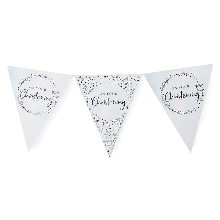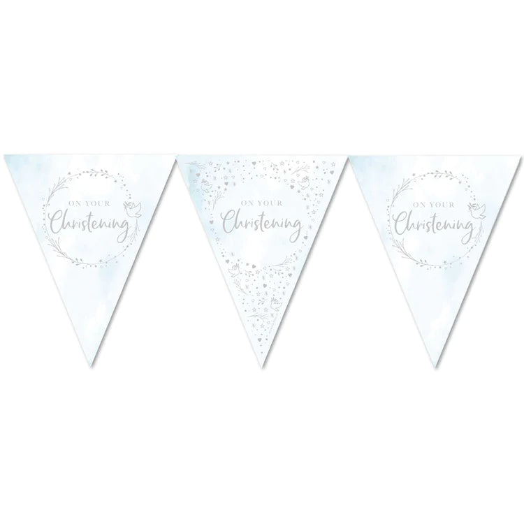 Liven up any Christening celebration with this 12ft paper flag banner featuring a soft blue watercolour background and silver foil stamped design and 'On Your Christening' sentiment.