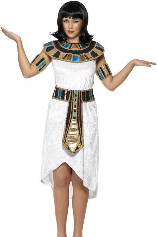 Egyptian costume for women - This Egyptian costume for women consists of a dress in white velvet effect, belt and collar with gold trim and matching colors, as well as gold embroidered bracelets with jewel effect. In addition, the dress has a slit on the side at the front. a more stylish effect (wig and shoes not included). This costume is perfect for portraying an Egyptian queen for carnival or at a fancy dress party."