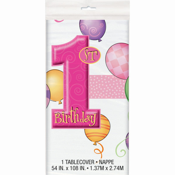 First Birthday Pink Balloons Rectangular Plastic Table Cover, 54"x84"