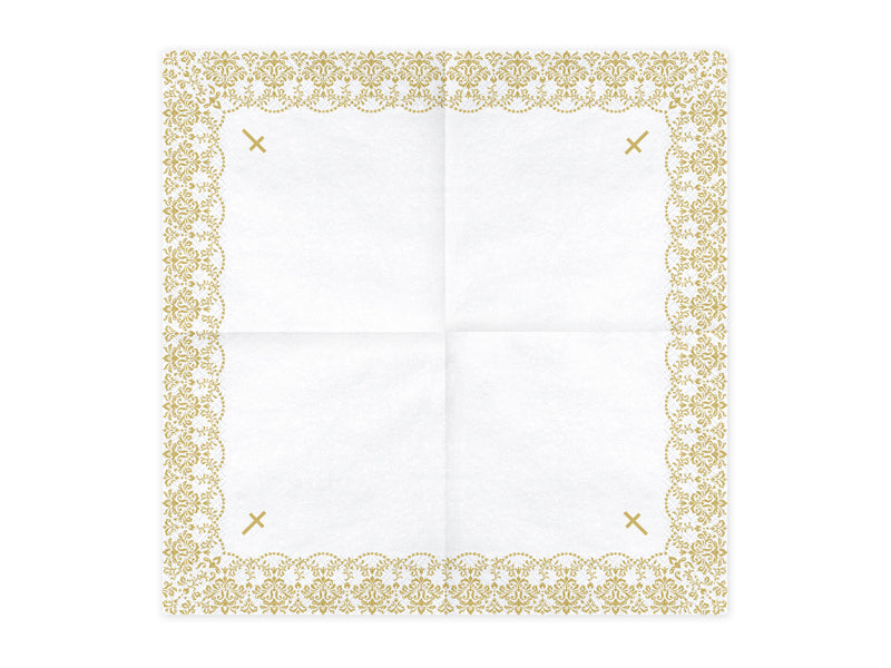 Pack Of 20 White paper napkins with a golden ornament, dimensions after unfolding approx. 33 x 33 cm, dimensions after folding approx. 16.5 x 16.5 cm.