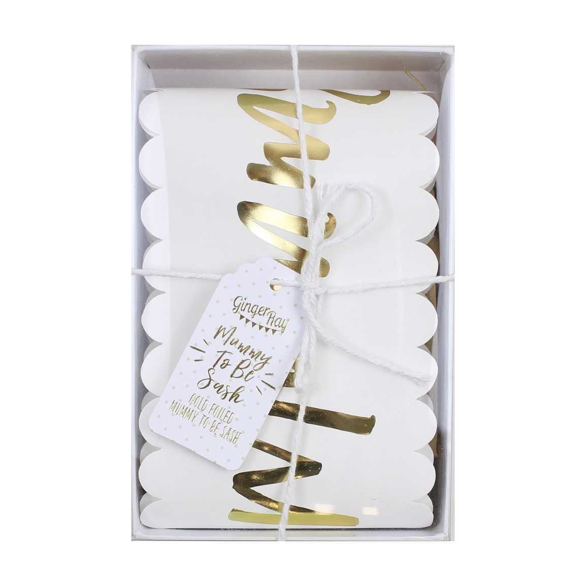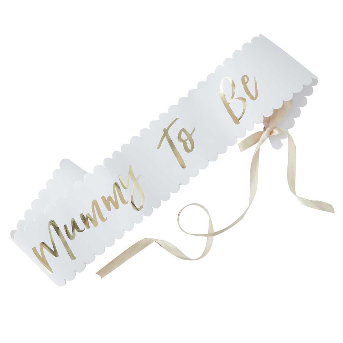 Our mummy to be sash has beautiful gold scripted foiled writing saying 'Mummy To Be' on a white soft paper background. A cute finishing touch for making special memories. Why not take a look at our Oh Baby range for matching gold baby shower decorations to continue the theme.
