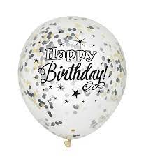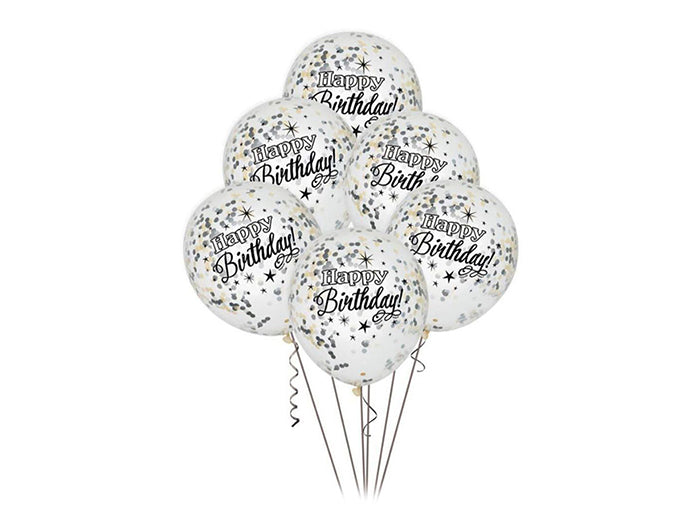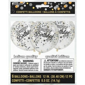 Pack of 6 clear 12in. (30cm) Biodegradable Happy Birthday latex balloons with 14g of black, silver & gold confetti included (confetti is separate in the pack - it is not inside the balloons.) Funnel included to slide confetti into each balloon. Balloons require Helium to float.