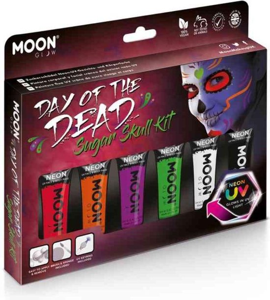 Create stunning effects on the face and body using our range of vibrant colours of Moon Glow Neon UV Face & Body Paint! Bright neon coloured paints in daylight that come alive under UV lighting / Blacklights, producing a spectacular UV Glow. Ready to use, water based face paints in a tube format, our flake free and smudge resistant formula ensures your designs will last all night. After use, simply remove with soap and water.